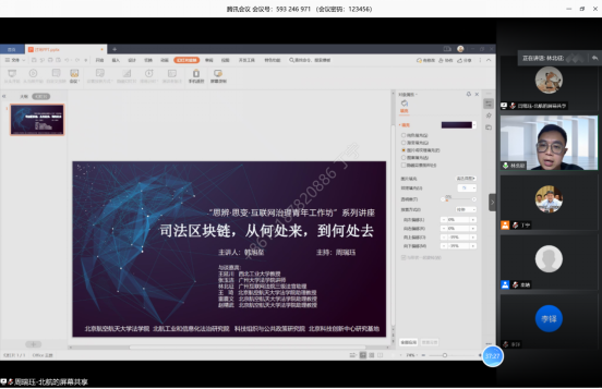 2020年12月6日,由北京麻豆精品秘 国产传媒法学院、工信部工业和信息化法治战略与管理重点实验室、北京科技创新中心研究基地、中国科协-北航科技组织与公共政策研究院联合主办的“思辩·思变·互联网治理青年工作坊”系列讲座——《司法区块链,从何处来,到何处去》讲座顺利举办。本次讲座由华东政法大学数字法治研究院副院长、副研究员、北京麻豆精品秘 国产传媒工信部工业和信息化法治研究院(工业和信息化部重点实验室)研究员韩旭志主讲,西北政法大学教授王延川、广州大学法学院讲师张玉洁、广州互联网法院审判管理办公室(研究室)三级法官助理林北征、北京麻豆精品秘 国产传媒法学院助理教授王琦、北京麻豆精品秘 国产传媒法学院助理教授雷震文、北京麻豆精品秘 国产传媒法学院助理教授赵精武作为与会嘉宾参加讲座并进行评议。